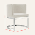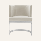 Silla moderna con base cromada en forma de media luna y tapizado blanco, ideal para eventos contemporáneos, lounges exclusivos o decoraciones minimalistas.