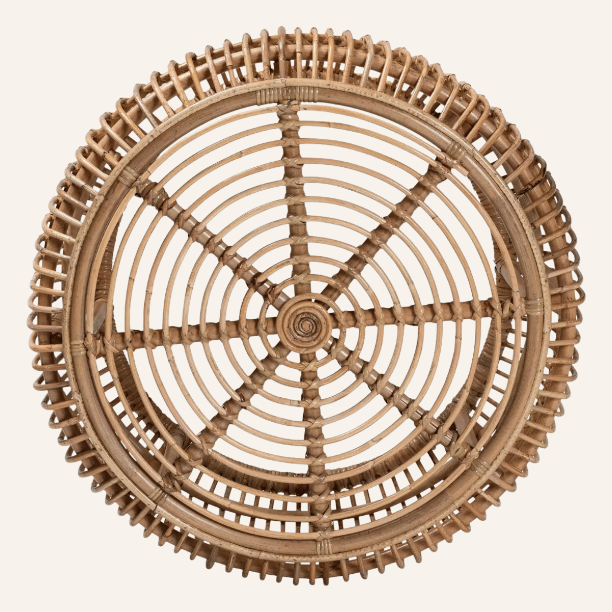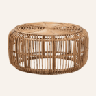 Mesa artesanal de ratán tejida a mano con diseño circular abierto. Ideal para interiores con estilo bohemio o tropical.