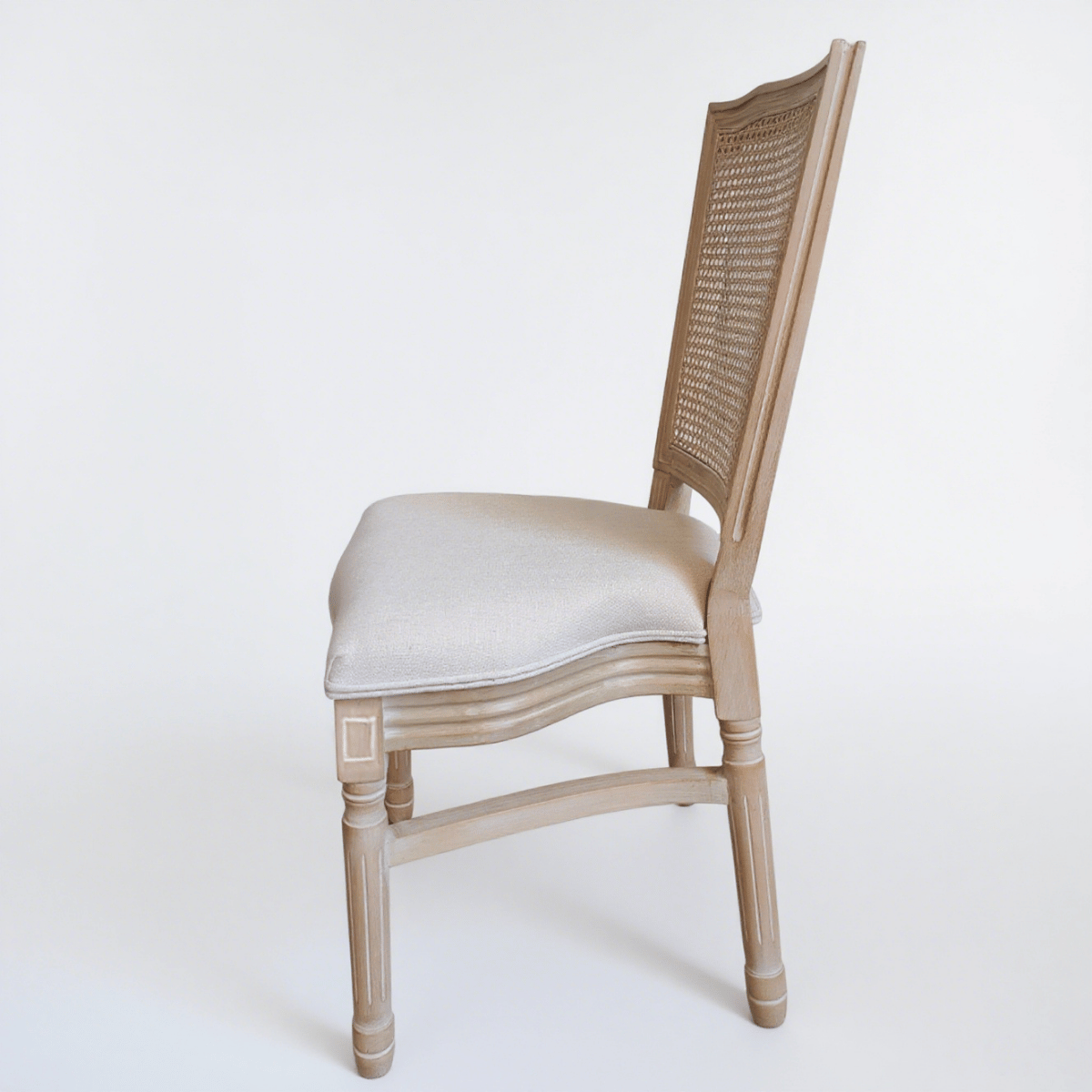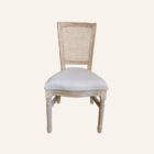 Un clásico que nunca falla. Esta silla combina un respaldo de ratán trenzado con una estructura de madera tallada y acabado natural envejecido. Su asiento acolchado en tela neutra aporta elegancia y confort, ideal para recepciones, bodas o eventos con estilo vintage o campestre.