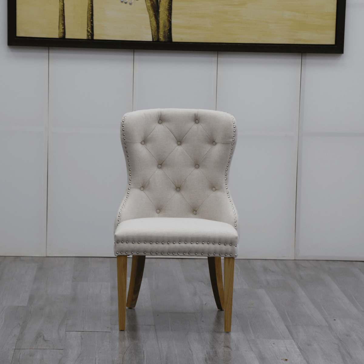 Silla elegante con tapizado capitoné en tono neutro y detalle de tachuelas metálicas, ideal para eventos formales, cenas VIP o decoración de lujo.