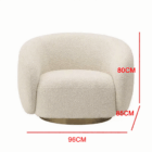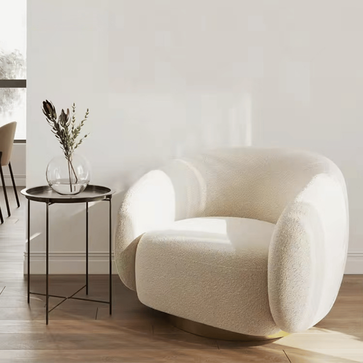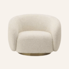 Sillón tapizado en bouclé blanco con base giratoria metálica, ideal para lounges modernos, eventos elegantes o rincones de confort con estilo.
