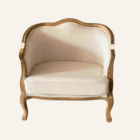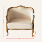 Butaca de inspiración Luis XV con estructura de madera natural tallada y acabado rústico. Tapizado en lino beige claro, ideal para bodas, eventos elegantes o espacios de estilo vintage y francés.