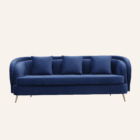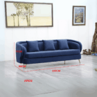 Sofá contemporáneo tapizado en terciopelo azul marino con patas doradas y cojines incluidos, perfecto para eventos modernos, espacios lounge o recepciones elegantes.