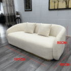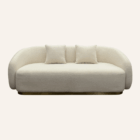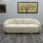 Sofá tapizado en bouclé blanco con base metálica y cojines decorativos, ideal para lounges de alto nivel, eventos minimalistas o espacios con estética moderna y cálida.