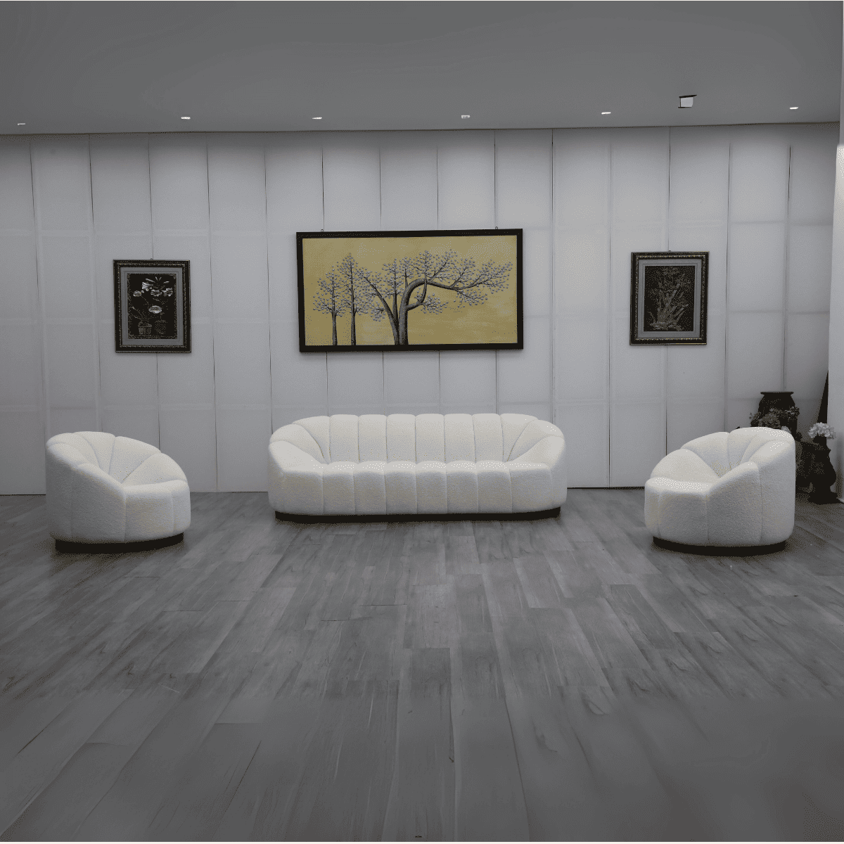 Sofá tapizado tipo bouclé con diseño envolvente y elegante. Ideal para áreas lounge, recepciones y eventos con estilo.