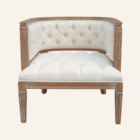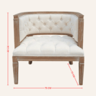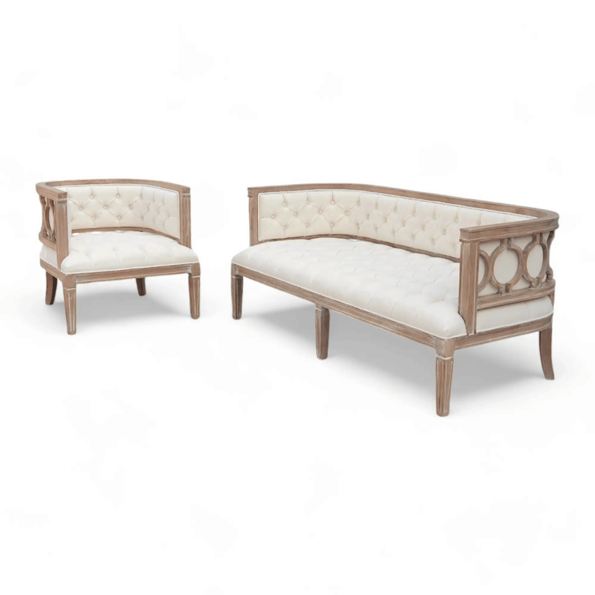 Sofá de madera con acabado vintage y tapizado capitoné en lino blanco, ideal para bodas rústicas, sesiones fotográficas o ambientes con encanto clásico.