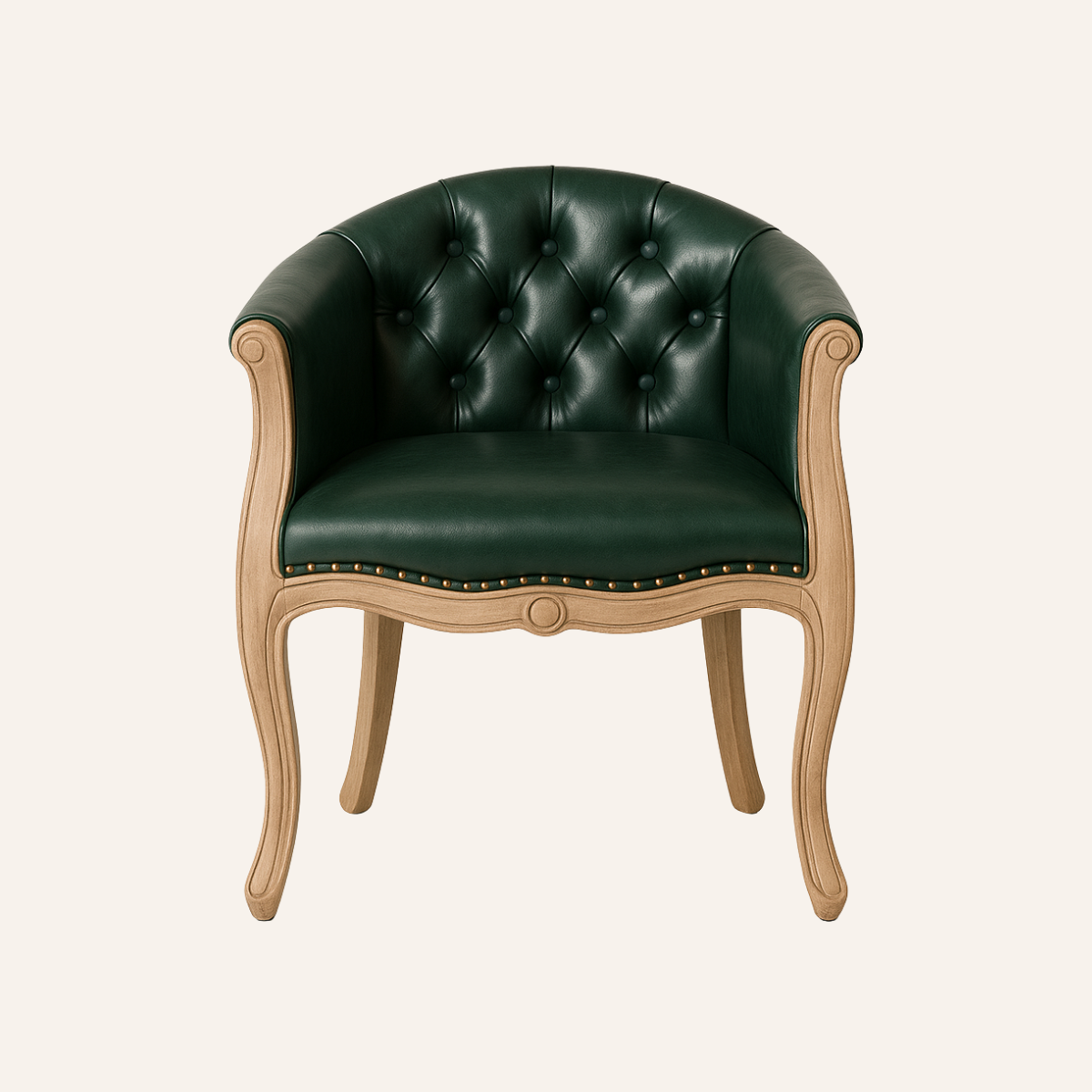 Silla de estilo clásico con estructura de madera tallada y respaldo capitoné tapizado en cuero oscuro. Ideal para ambientes elegantes como salas, oficinas, eventos o zonas lounge con carácter.