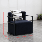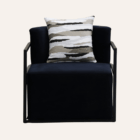 Sillón tapizado en negro con estructura metálica cuadrada y cojín decorativo, ideal para espacios modernos, zonas lounge o eventos corporativos con estilo minimalista.